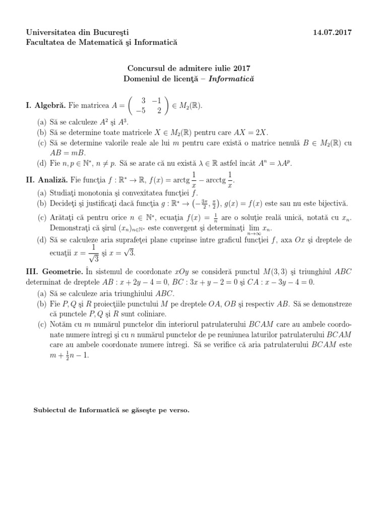 Admitere 2019 Subiecte Admitere Matematica Informatica Date In Anii Anteriori Facultatea De Matematica Si Informatica Bucuresti Analiza Algebra Geometrie Informatica Fizica Jitaruionelblog Pregatire Bac Si Evaluarea Nationala 2021 La